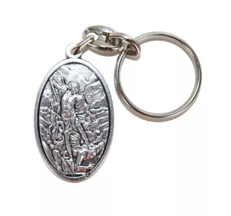Adoptez ce beau porte-clés ovale de St Michel, en métal argenté !