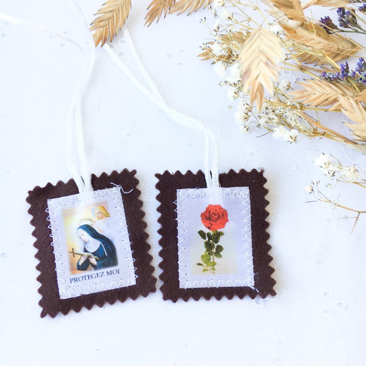 Ce scapulaire de dévotion à Sainte Rita est composé de 2 rectangles de tissus marron sur lesquels sont cousus deux images : la première est l'image de Sainte Rita portant le crucifix, et la deuxième est l'image d'une rose.
