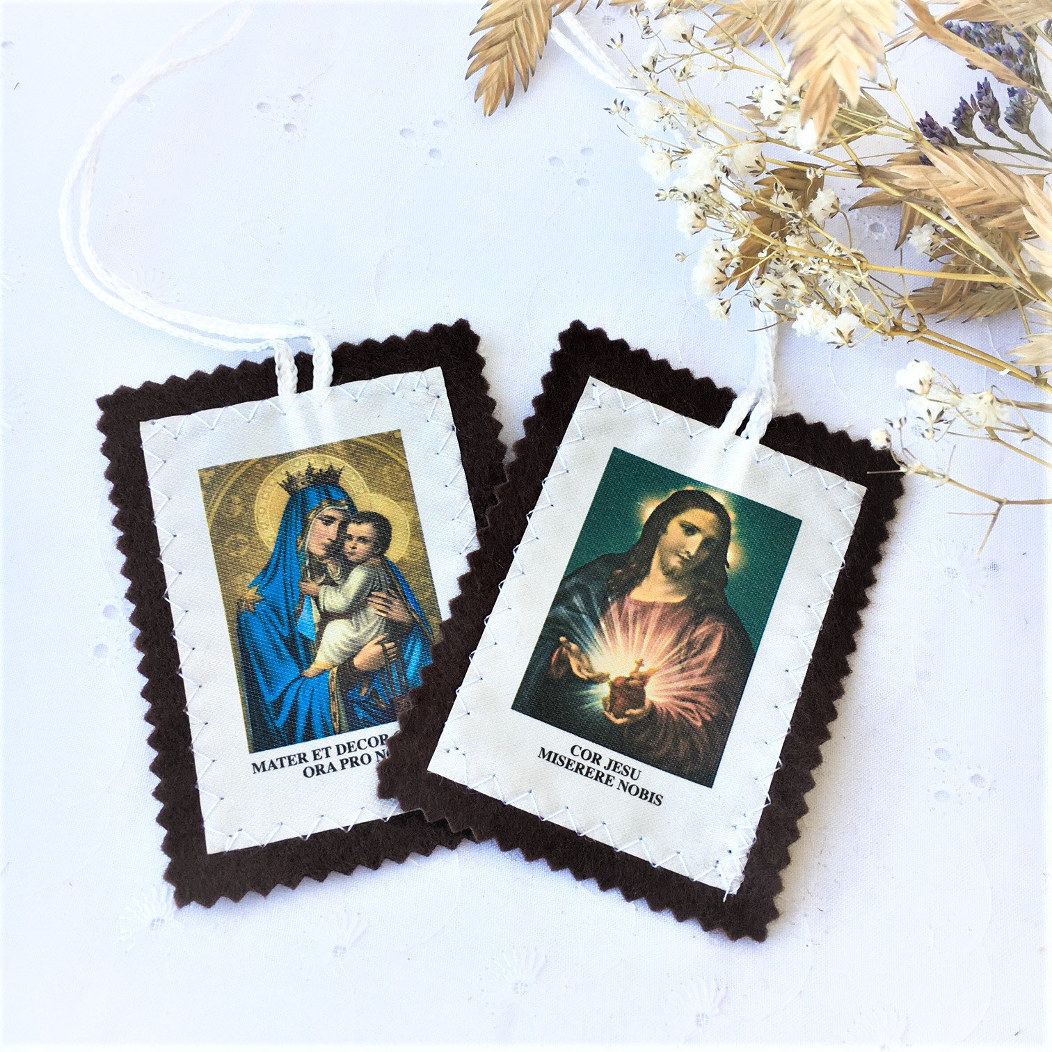 Grand Scapulaire en tissu de Notre-Dame du Mont Carmel et du Sacré-Coeur de Jésus.