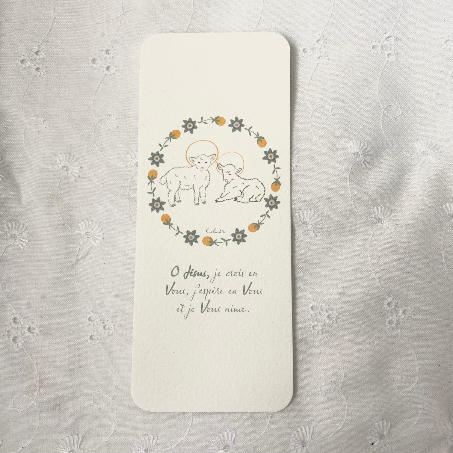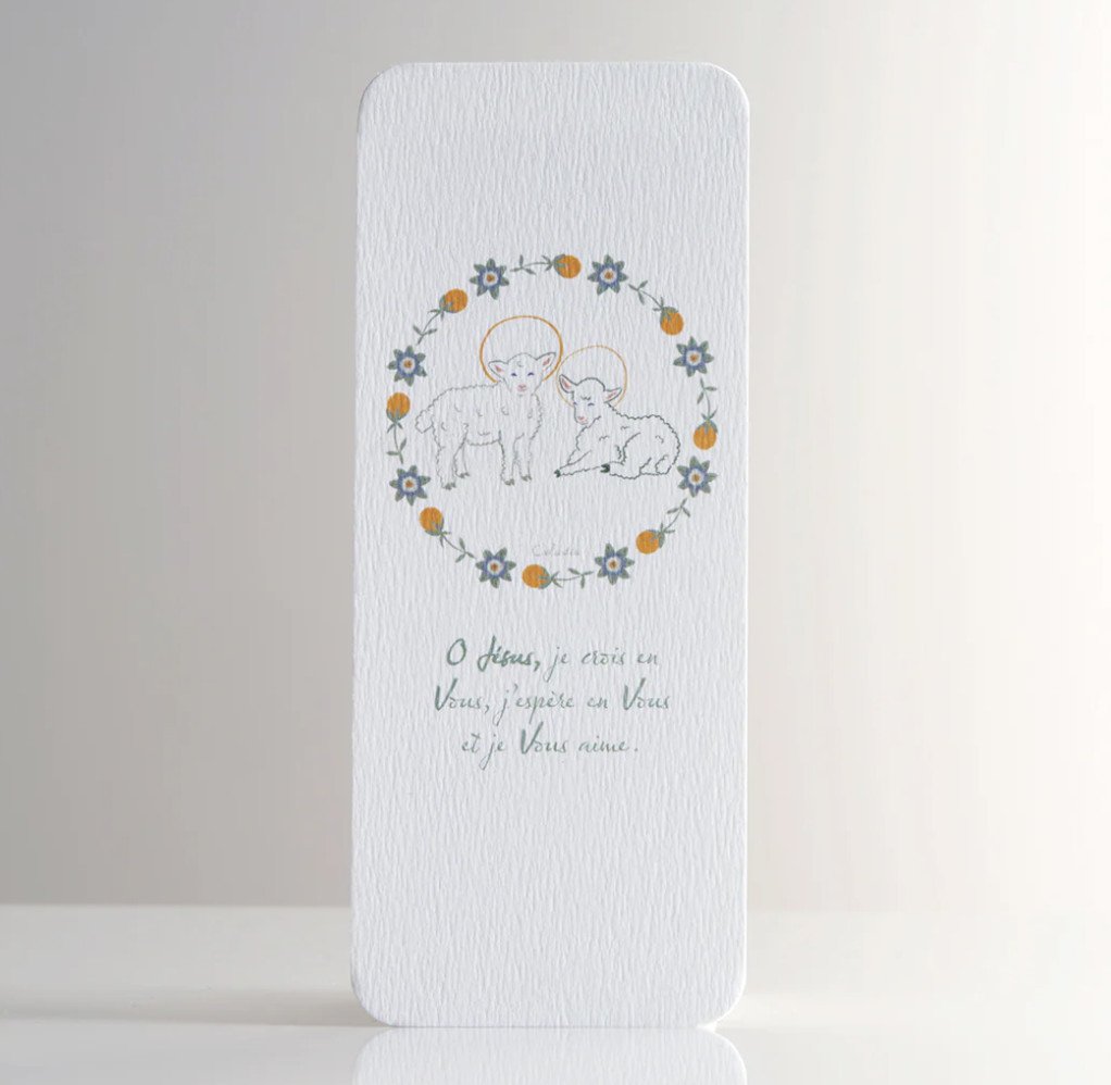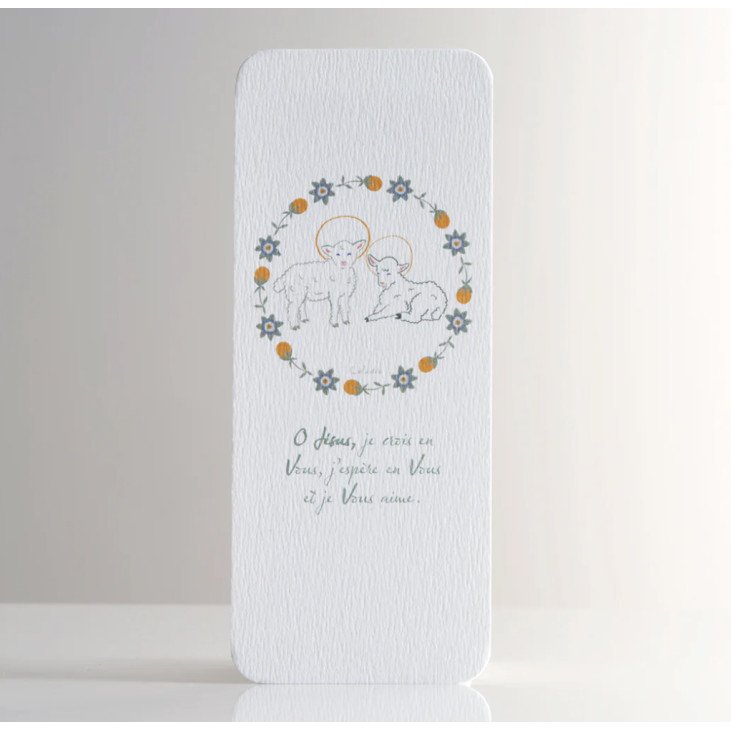 Voici de jolis signets de cérémonie, représentant deux petits agneaux dans une couronne de fleurs de passiflore. Le dessin délicat, signé Caladia, est accompagné de la prière de l'Ange à Fatima : " Oh jésus je crois en Vous, j'espère en Vous et je Vous aime "
