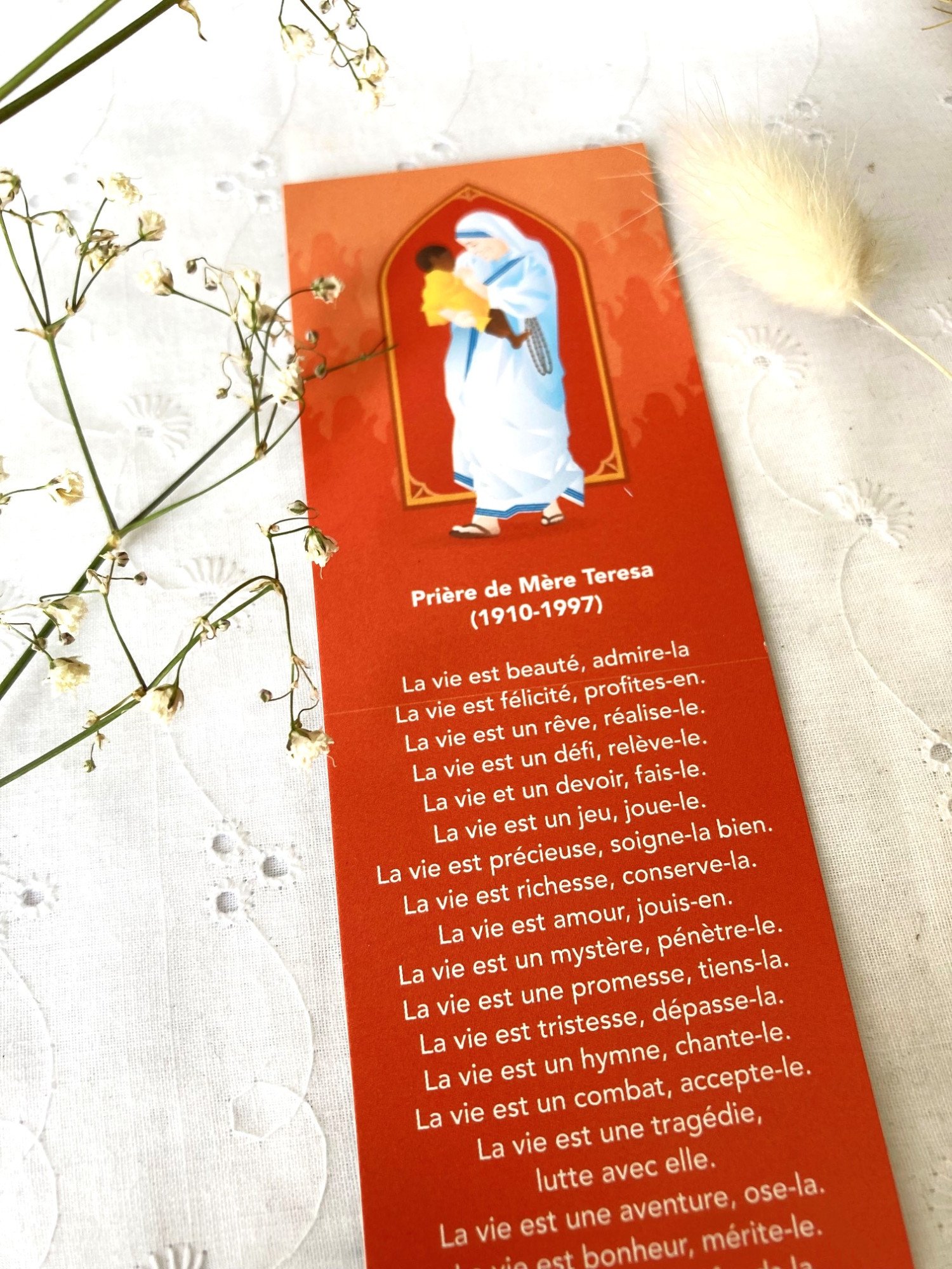 Le signet - Sainte Mère Teresa représente la sainte religieuse portant dans ses bras un enfant, sur un beau fond orangé dégradé évoquant la foule de pauvres qu'elle a cherché à soigner tout au long de sa vie. La prière "La vie" de Mère Teresa, est proposée sur ce signet.