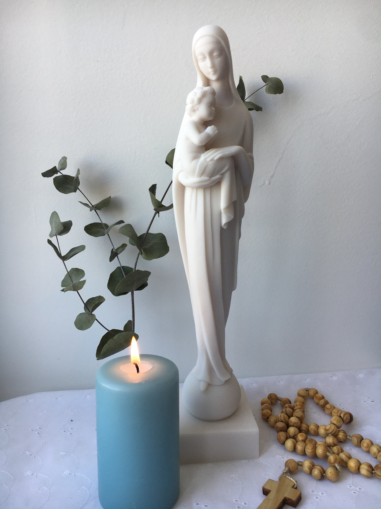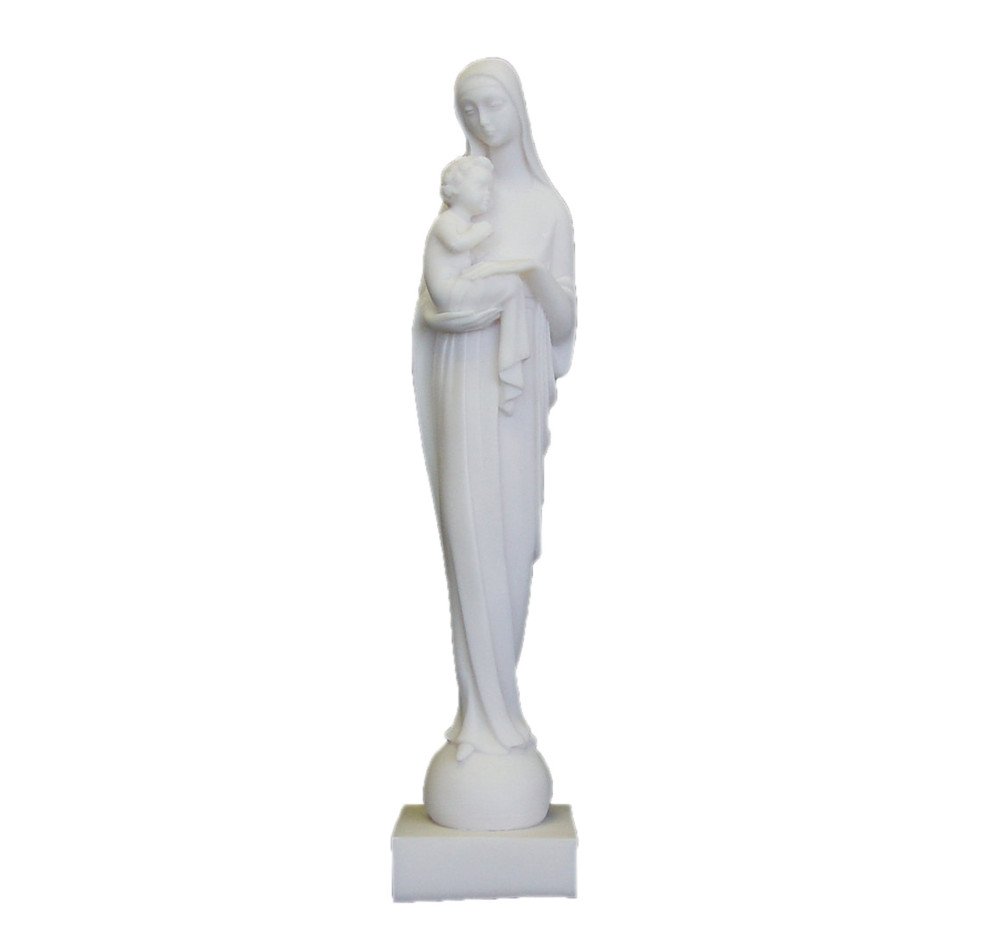 Admirez les détails de cette statue, la forme des vêtements de la Vierge à l'Enfant et l'expression de son visage. Les statues en albâtre blanc peuvent être disposées tant à l'intérieur de votre maison qu'à l'extérieur, et fera très bon effet si vous l'offrez à ceux que vous aimez.