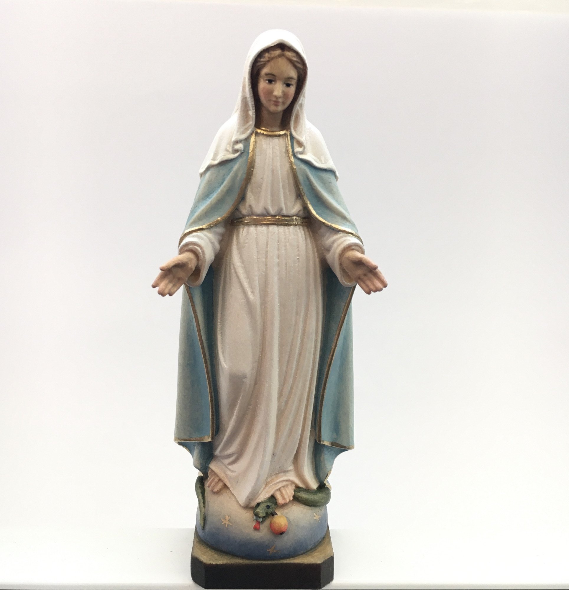 Laissez vous séduire par le charme de cette jolie statue en bois sculptée polychrome de 14 cm à l’effigie de la Vierge Miraculeuse.