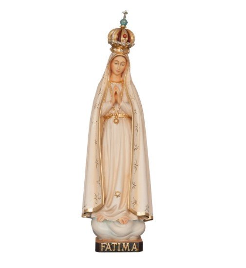 Admirez cette ravissante statue en bois sculptée polychrome peinte à la main et représentant Notre-Dame de Fatima. Les détails respectent la description donnée par les trois petits bergers : un manteau blanc, une jupe blanche avec des chaînettes obliques, une veste blanche et autour du cou, une chaîne en or avec une médaille.
