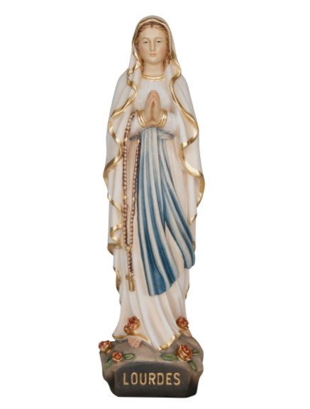 Cette statue en bois sculptée de 14 cm peinte à la main, est une représentation de Notre-Dame de Lourdes fidèle à la description donnée par Bernadette Soubirous : vêtue de blanc, une ceinture descendant le long de sa robe, un voile sur la tête, portant un un grand chapelet et avec deux roses à ses pieds.