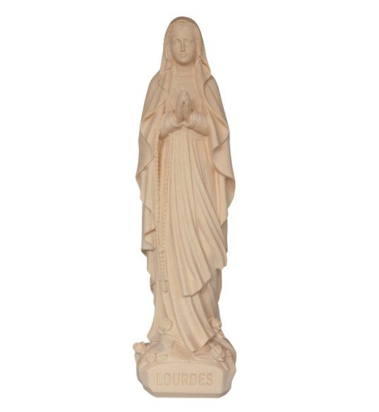 Cette statue en bois sculptée de 14 cm est une représentation de Notre-Dame de Lourdes fidèle à la description donnée par Bernadette Soubirous : vêtue de blanc, une ceinture descendant le long de sa robe, un voile sur la tête, portant un grand chapelet et avec deux roses à ses pieds.
