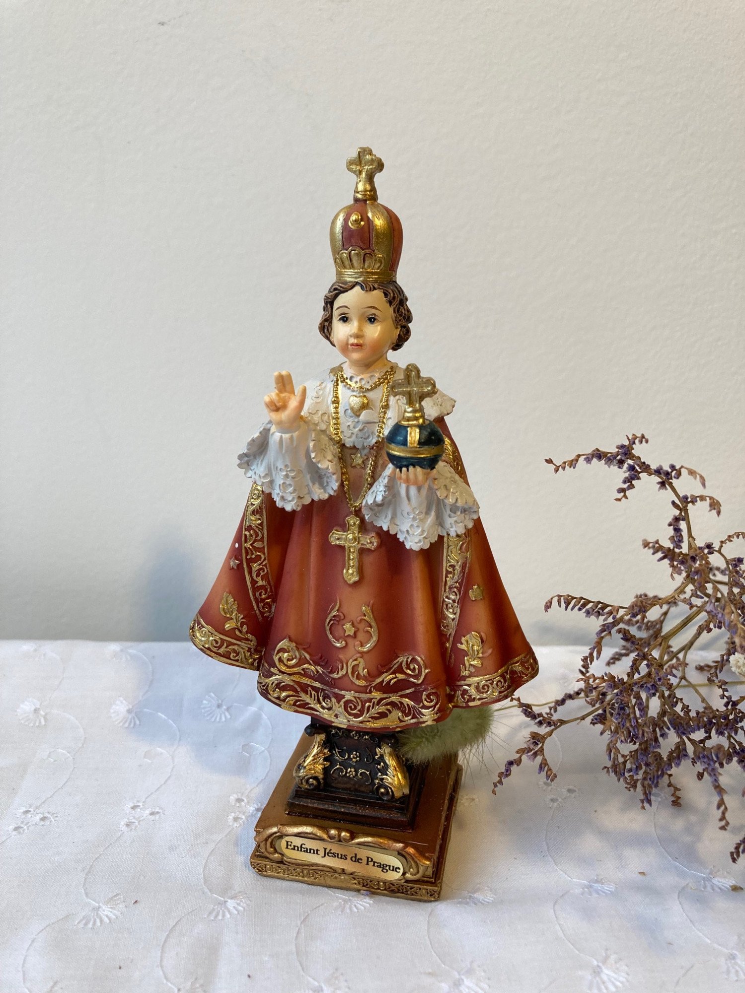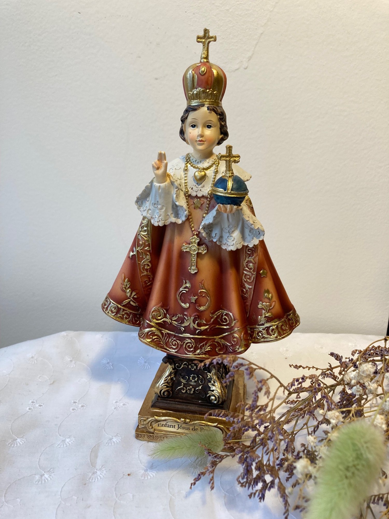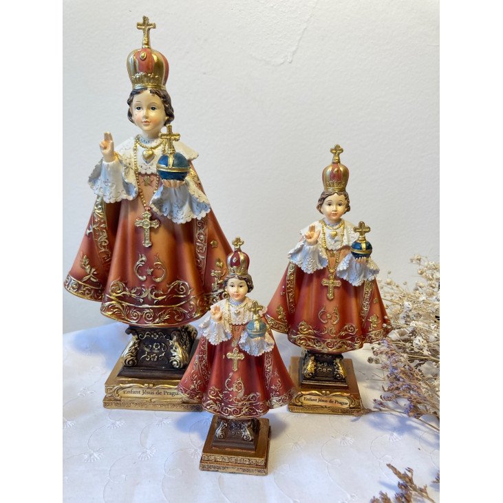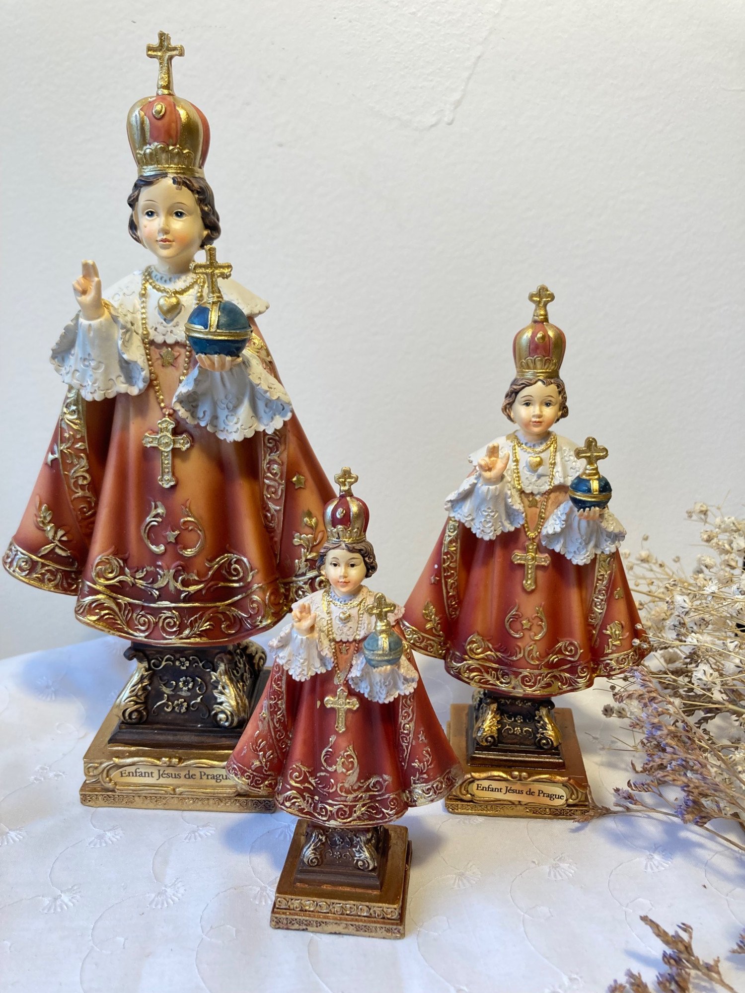 Reproduction fidèle de la célèbre statue vénérée à Prague, cette statue de l’Enfant Jésus de Prague représente le Christ enfant, Roi de l’univers. Chaque modèle est identique à l’original conservé au sanctuaire de Prague, symbole d’espérance et de confiance en la Providence divine.