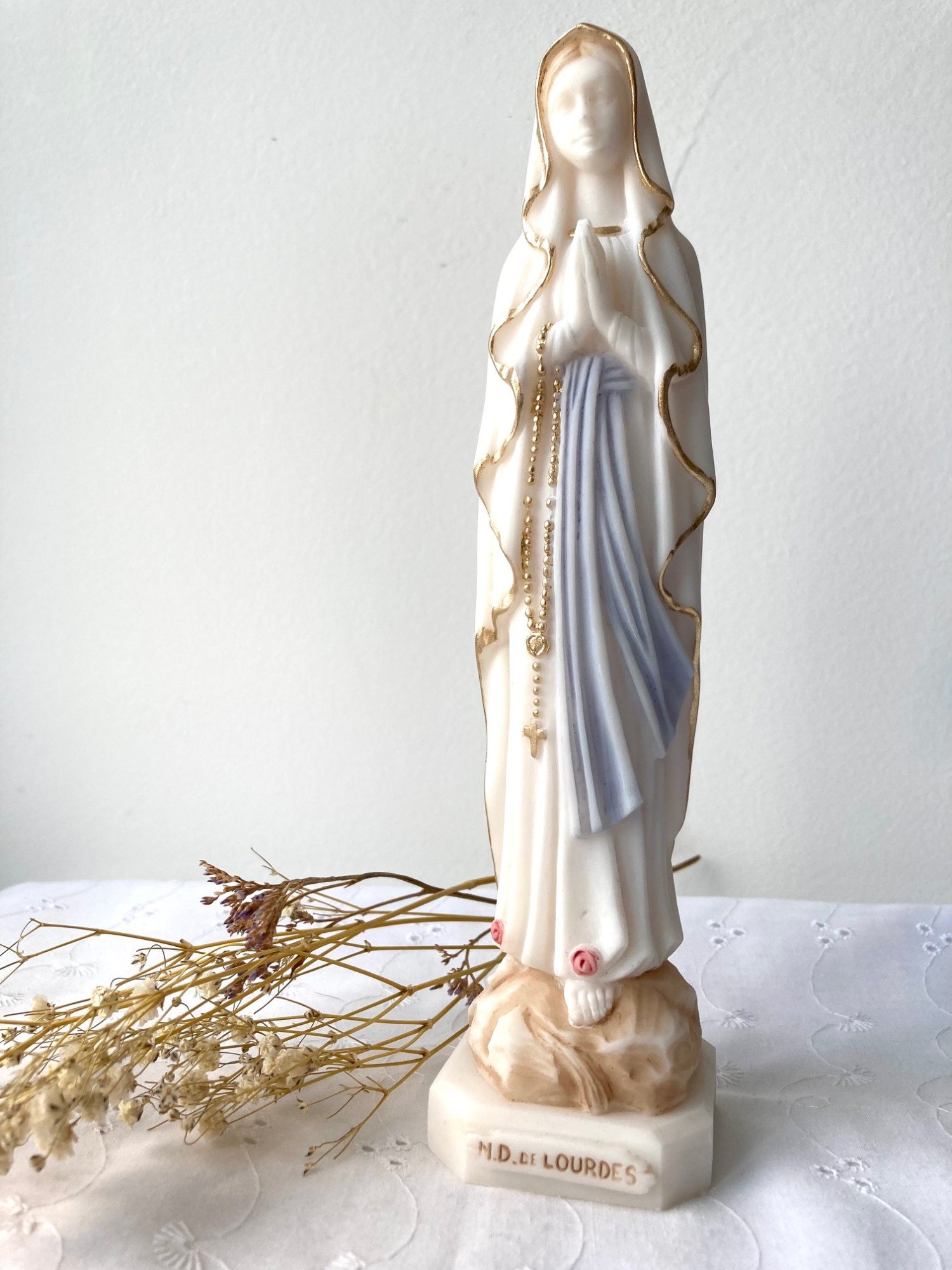 Cette statue mesure 20 centimètres de hauteur et est à l'effigie de la Vierge Marie de Lourdes.