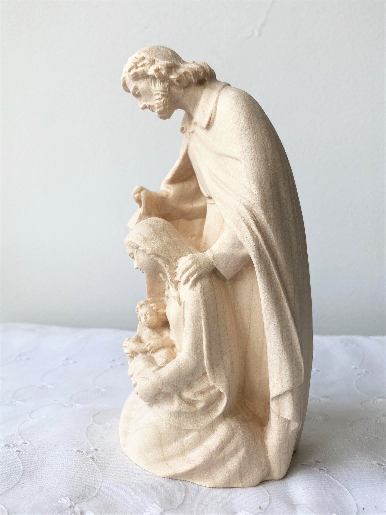 Remarquez les détails cette sculpture pleine de tendresse et de rondeur : La Vierge Marie, berçant doucement son enfant nouveau né, Jésus sauveur, est tendrement protégée par Saint Joseph qui se tient debout derrière elle, faisant de sa tunique une protection chaleureuse, tenant une lampe allumée à la main, le visage penché vers la mère et son tout-petit.