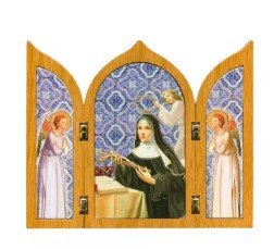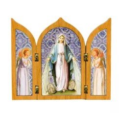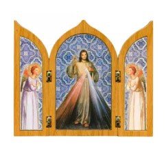 Triptyques façon bois clair représentant la Vierge Marie, le Christ Miséricordieux ou un Saint patron, entouré de ses anges.