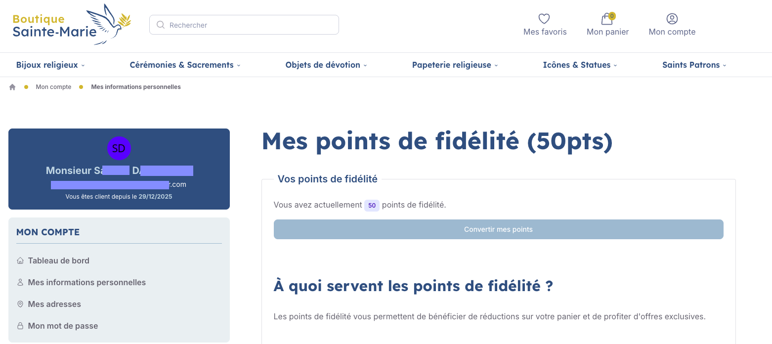 Notre programme de fidélité Comment profiter de vos avantages Boutique Sainte Marie ?Fidèles à nos valeurs de proximité et de tradition, nous avons conçu un système simple pour vous remercier de votre confiance et de votre attachement à nos produits artisanaux.Étape 1 : Accumulez vos points naturellementDès votre arrivée parmi nous, vous commencez à constituer votre cagnotte. Il existe trois façons de voir grandir votre solde :Votre adhésion : Dès la création de votre compte client, nous déposons 50 points de bienvenue dans votre escarcelle pour fêter votre arrivée.Vos achats : C’est la récompense de votre soutien à notre savoir-faire. Pour chaque euro investi dans notre boutique, vous gagnez 1 point (1€ = 1 point).Votre témoignage : Parce que votre avis est essentiel pour faire rayonner notre travail, chaque avis déposé sur un produit acheté vous rapporte 50 points supplémentaires.Étape 2 : Suivez l'évolution de votre privilègeVous n'avez rien à calculer, nous nous occupons de tout. Pour consulter votre solde rendez-vous sur votre compte dans l'onglet Mes Points de FidélitéÉtape 3 : Convertissez vos points en réductionsDès que vous avez accumulé suffisamment de points, vous pouvez les transformer en remise immédiate pour vos futurs achats. Voici notre règle de conversion basée sur la générosité :Seuil de pointsVotre privilège300 points5€ de réduction immédiate600 points10€ de réduction immédiate900 points15€ de réduction immédiateÉtape 4 : Utilisez votre remiseC'est le moment de vous faire plaisir ! Lors de la validation de votre panier, il vous suffit de cliquer sur le bouton "Convertir mes points". La réduction s'appliquera automatiquement sur le montant total de vos articles sur notre Boutique.Une question ? Notre équipe est à votre disposition pour vous accompagner, avec la proximité qui nous est chère. Merci de faire partie de la famille de la Boutique Sainte Marie.